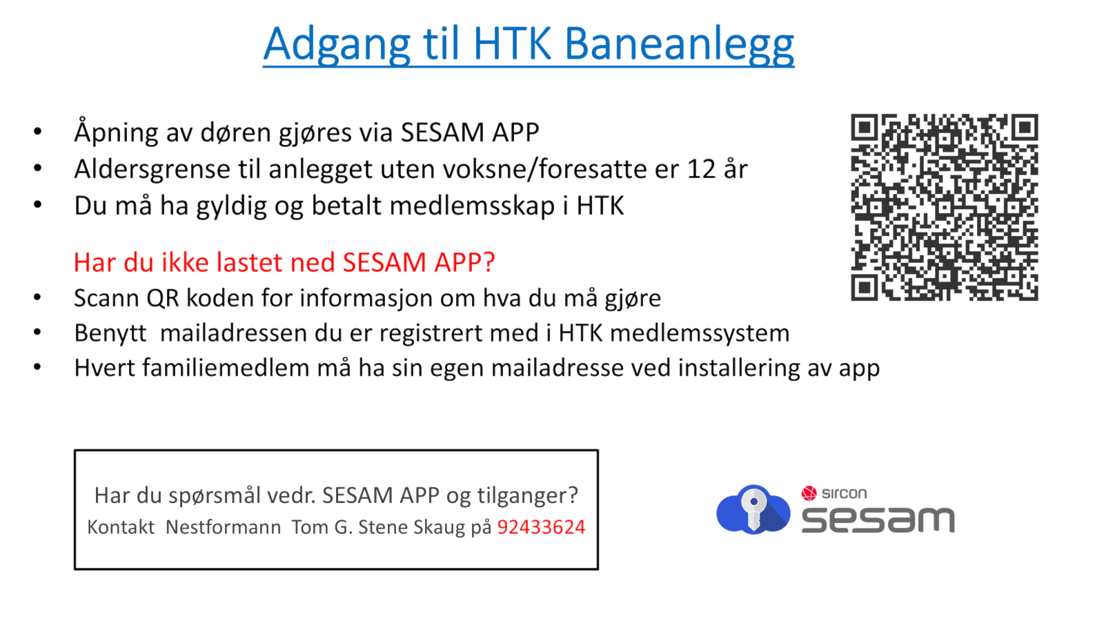 SESAM appen vil ikke fungere når uteanlegget er stengt for vintersesong. Når anlegget åpnes for utebruk vil alle med gyldig medlemskap og som har lastet ned SESAM APP få tilgang til utebaner og WC. Styret i HTK og noen utvalgte har adgang til Klubbhus og Materialrom, så dette er ikke noe alle har.